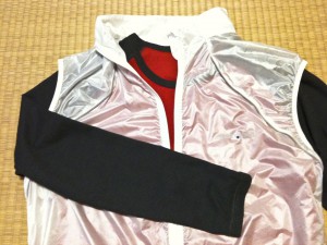 14℃〜18℃位では、ロングTシャツに風を通さないベストの組み合わせ。