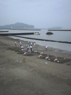 普通の海岸に、砂遊びよろしく埋められている人々。。。