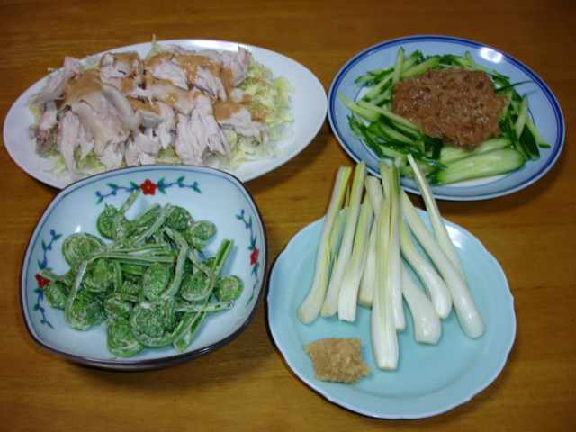 蒸し鶏、くらげ、こごみ、エシャロット。。。