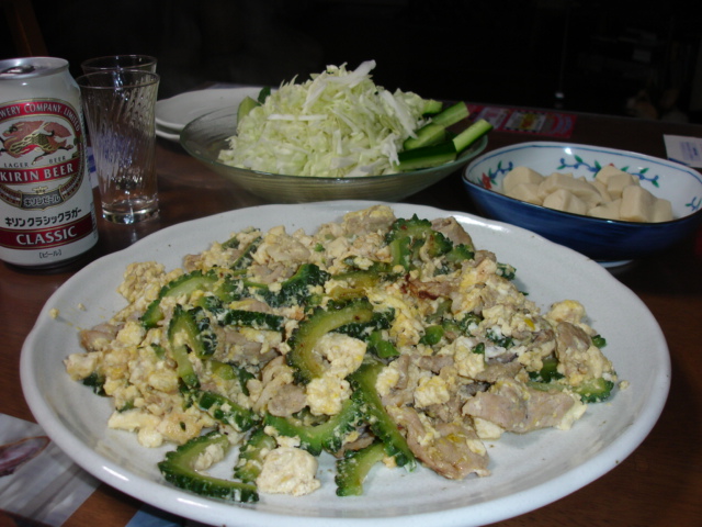 途中、豆腐をレンジにかけて水分を飛ばしている間、マロポにニガ瓜を与えてみました。