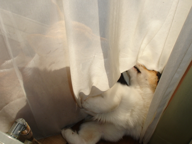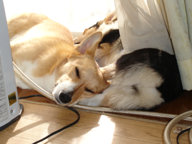 マロンちゃんカーテン越しにでも、ポッキーちゃんを枕にするの図面白いですね~
