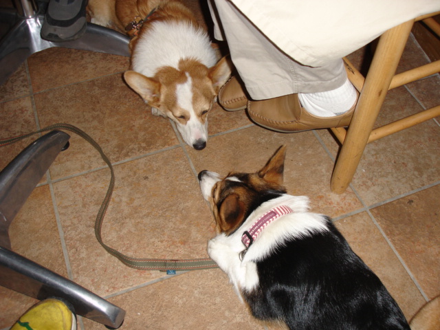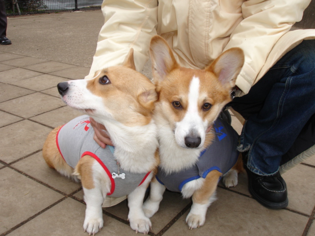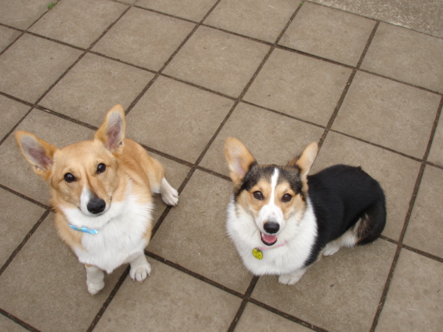 やっぱりトライカラーのコーギーは珍しいので、「兄弟ですか?」って
