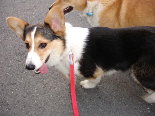 玄関先からガウガウしながらも、チャッチャカ歩くマロンとポッキー。