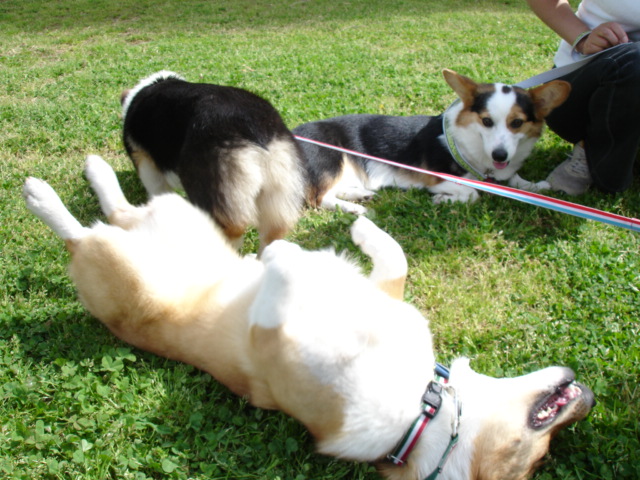 ココも芝生に行くとよくやりますが、お友達に会うと誰にでもその体勢になります。。。
