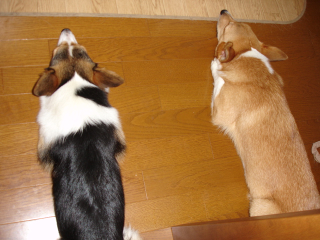 カイヌシ~ズが食事している時、マロンはダイニングテーブルの下、 ポッキーはカーテンの中や床のど真ん中で、寝ています。しかし、 本当にごく稀に、ポッキーがダイニングテーブルの下にやってくる場合があります。 この写真は、そんなシャイなポッキーの、貴重な写真です。 こんな風に仲良く並ぶのは、非常に珍しいのでした。 仲良く「川の字」になってます。一本足りないですけど。。。 川の字 珍しいので、別の角度から。