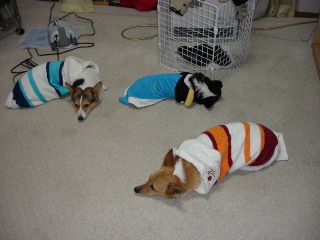 1頭ずつ乾かすのが面倒くさいので、バスローブ着せて