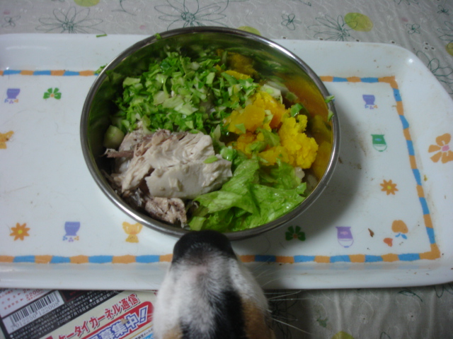 サバの煮汁で作ったおじや。それに、キャベツ、レタス、カボチャのトッピングです。